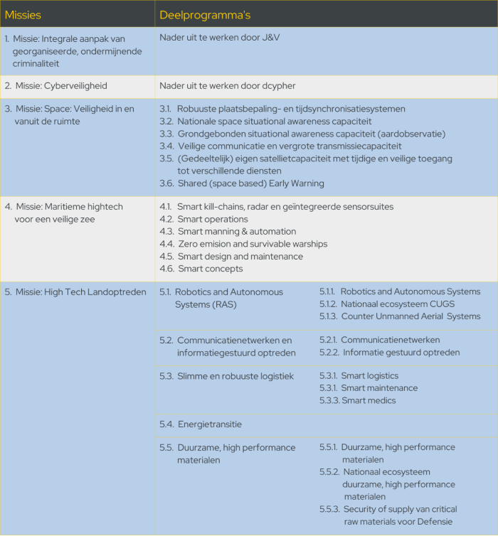 In deze paragraaf beschrijven we kort de vijf missies zoals ze opgesteld door Defensie, JenV en EZK, hun respectievelijke deelprogramma’s, wat we per missie op hoofdlijnen hebben bereikt en wat de mogelijke kennis- en innovatievragen voor de periode 2024-2027 zijn.